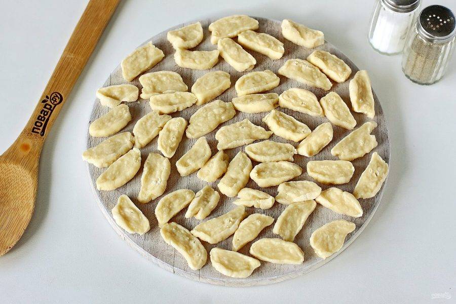 Раскатайте тесто колбаской и нарежьте небольшими кусочками.