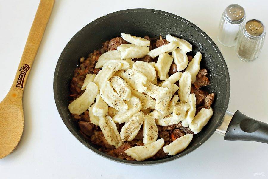 Когда печень будет готова, добавьте галушки, соль и перец по вкусу.