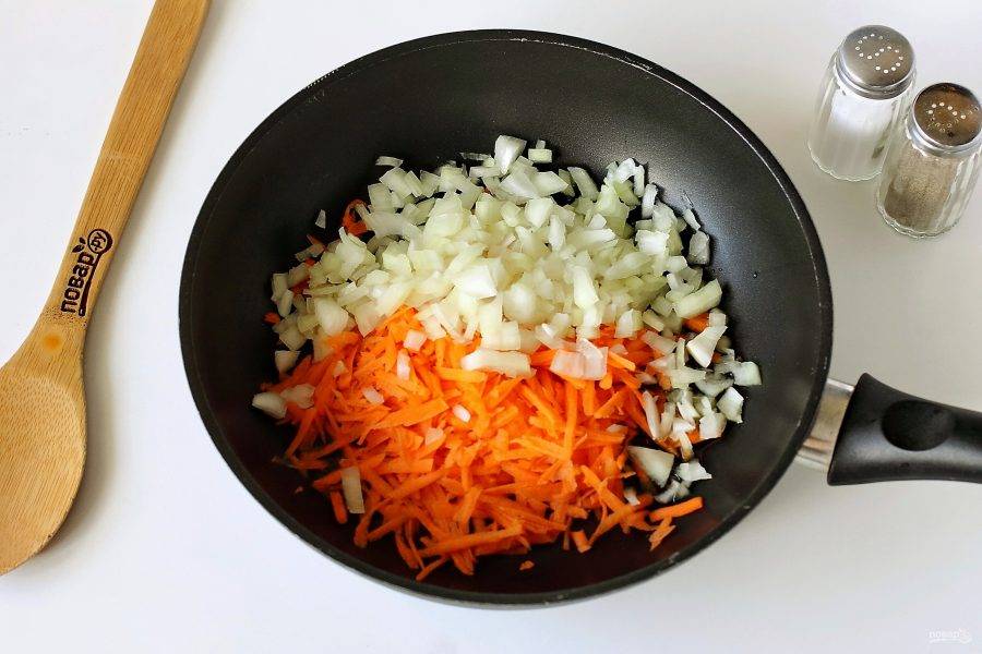 На сковороде разогрейте масло. Положите тертую на крупной терке морковь и лук, нарезанный кубиками.