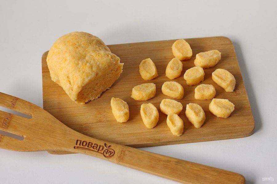Отщипните от теста кусок, раскатайте его колбаской и нарежьте кусочками. Размер зависит от желаемого размера галушек.