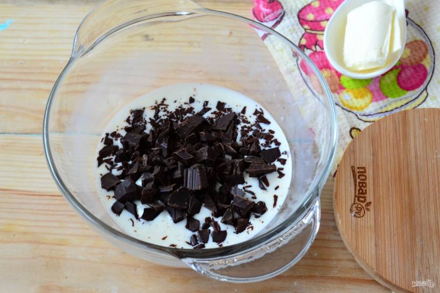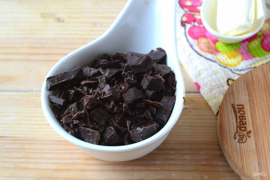 Пока прогреваются сливки, шоколад порубите ножом как можно мельче. Можно также натереть на терке или измельчить в кухонном комбайне.