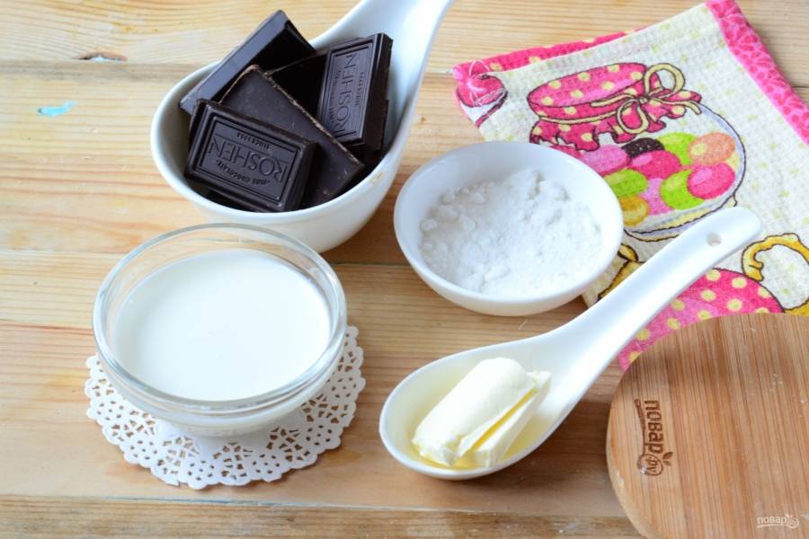 Подготовьте все необходимые ингредиенты. Если вы возьмете сливки меньшей жирности, то тогда используйте меньшее их количество, примерно 80 мл, чтобы ганаш не получился слишком жидким.