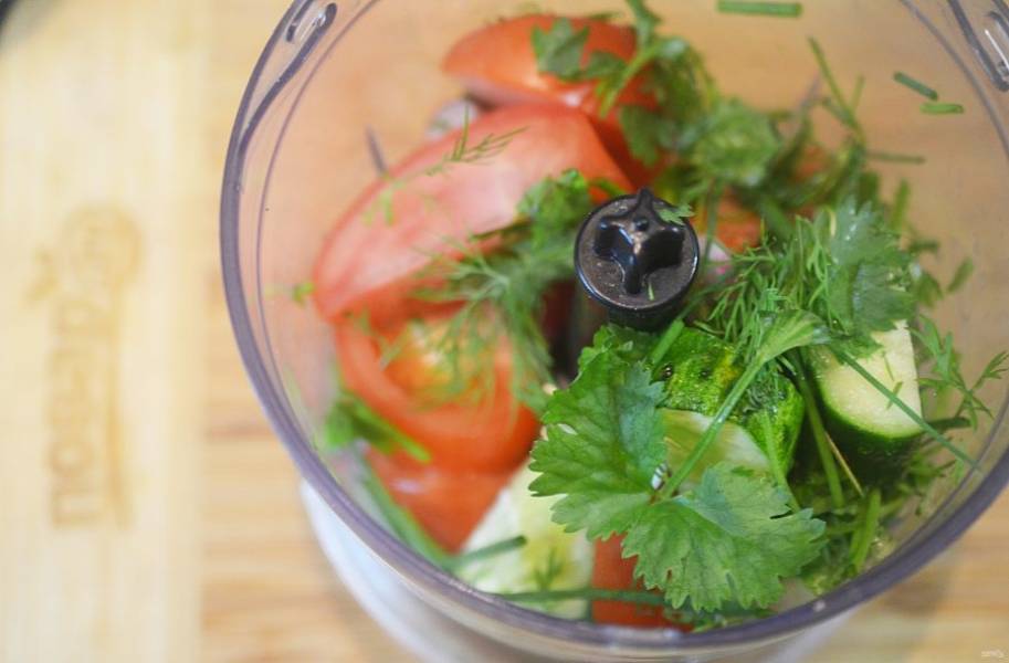 В чашу блендера сложите все крупно нарезанные овощи, 2/3 перцев, укроп, лук, петрушку, лимонный сок.