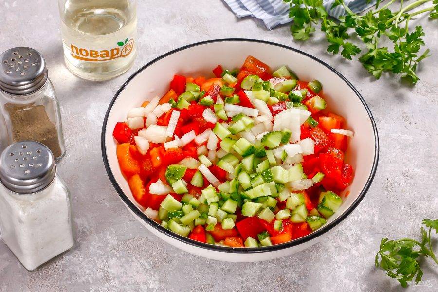 Срежьте хвостики у огурцов, промойте их в воде и нарежьте мелкими кубиками. Так же, как огурцы, нарежьте и половину луковицы. Перемешайте нарезки и немного отложите для украшения блюда.