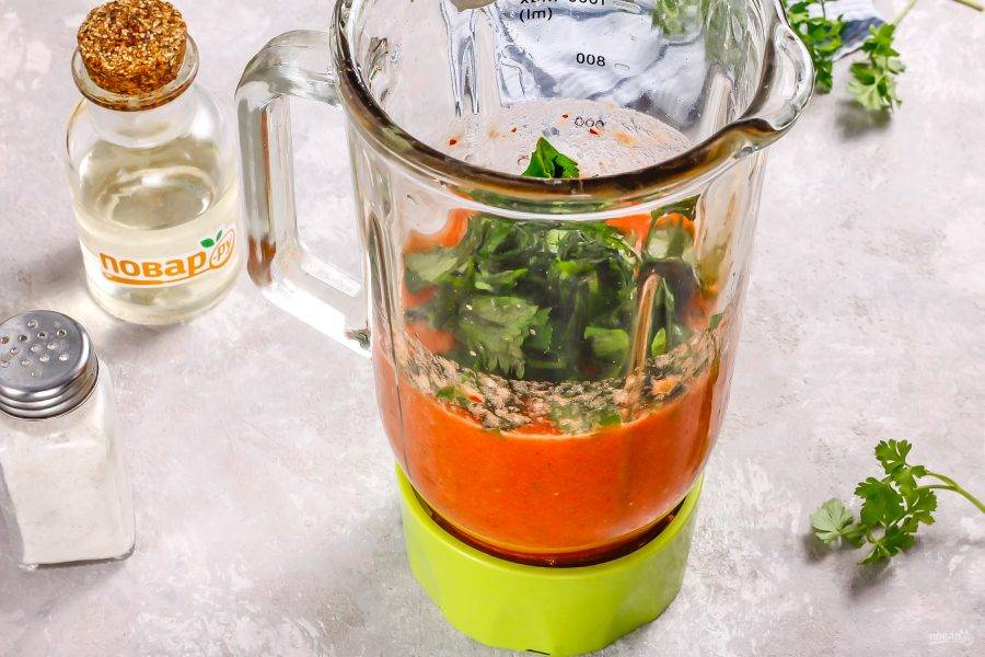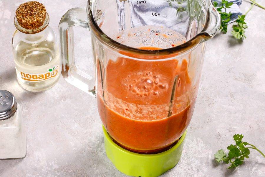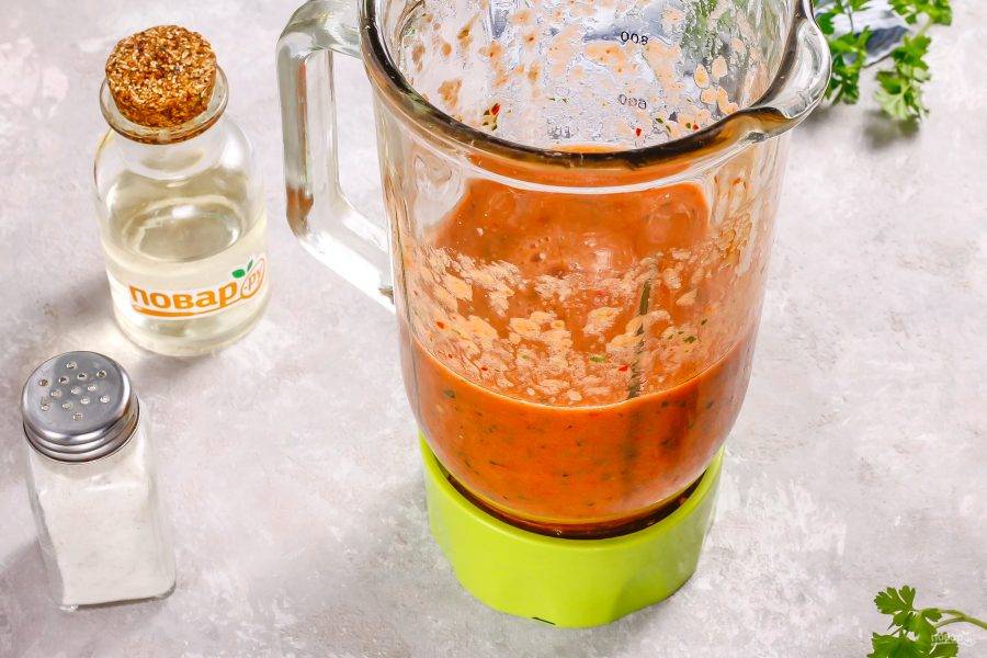 Всыпьте соль и молотый черный перец, измельчите все на пульсирующем режиме примерно 2-3 минуты.