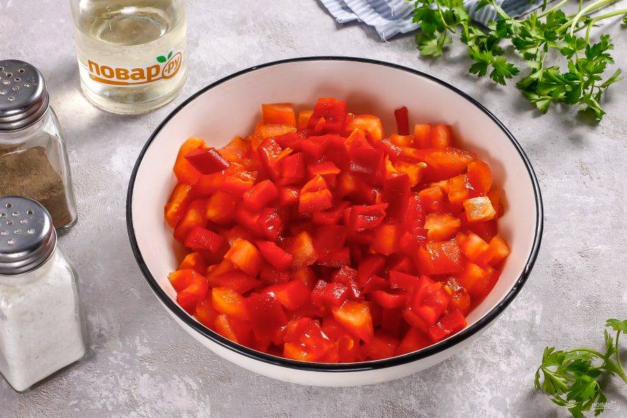 Помидоры ошпарьте в кипятке и снимите кожуру или же просто срежьте ее ножом. Перцы очистите от семян. Промойте плоды в воде и нарежьте мелкими кубиками.
