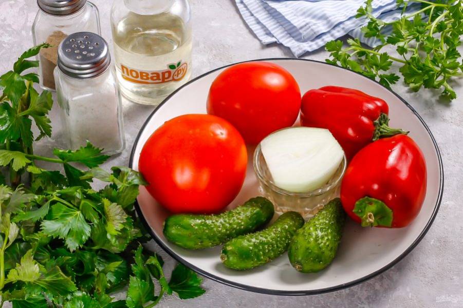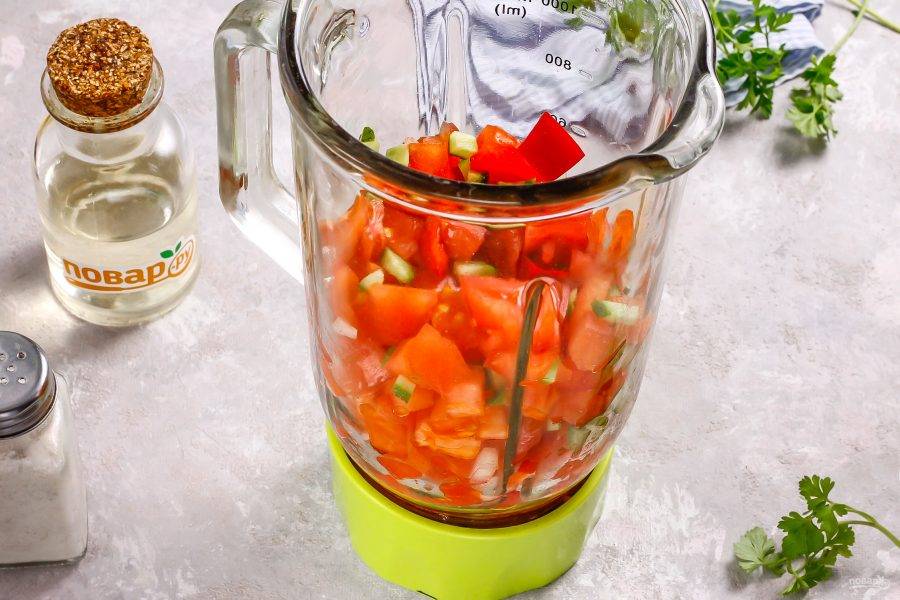 Красочный испанский холодный суп идеален в летний зной. Чтобы разнообразить вкус блюда, добавьте при измельчении стеблевой сельдерей или зелень сельдерея. Острый перец и лед добавляйте по желанию.