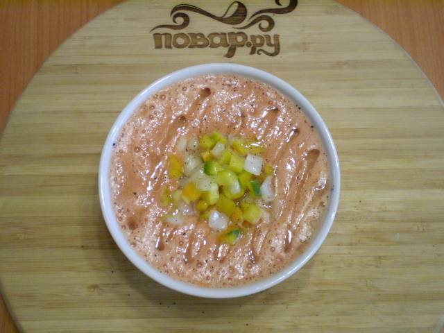 Переливаем в тарелочку, в центр кладем болгарский перец, лук и зелень. Поливаем оливковым маслом. Приятного! Суп подается холодным.