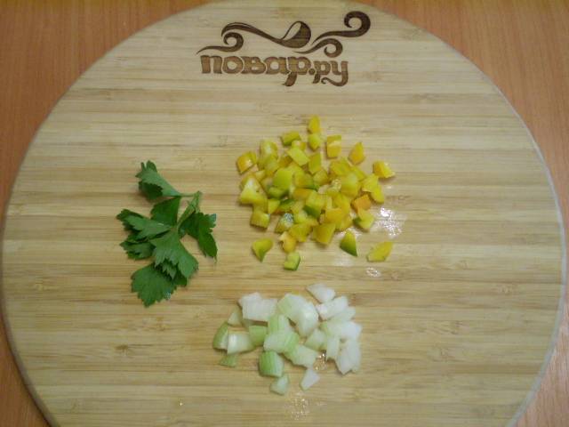 Часть перца порежьте кубиками. Лук также нужно мелко порезать. Вымойте веточку зелени: это для подачи супа.