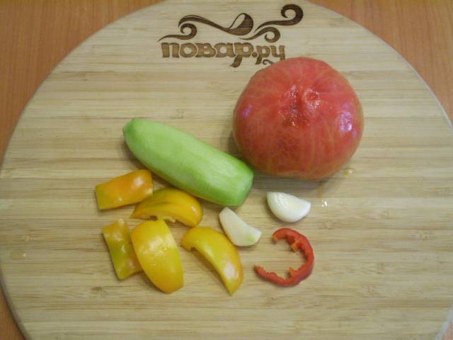 С огурца и помидора снимите кожуру, у перца удалите семена. Отрежьте кусочек перца чили.