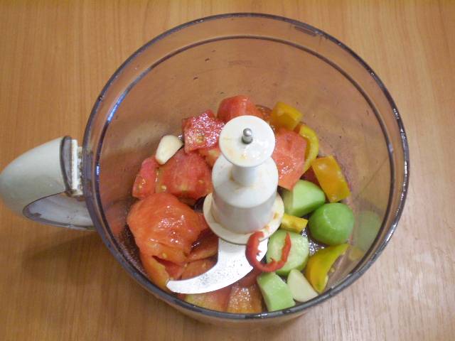 В чашу блендера кладем помидоры, огурец, половинку болгарского перца, кусочек чили, чеснок, соль и черный молотый перец. Можно добавить чуточку зелени, но немного, иначе суп будет иметь другой цвет.