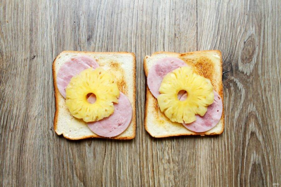 Ананас извлеките из сиропа и обсушите. Выложите кольца ананаса поверх ветчины.