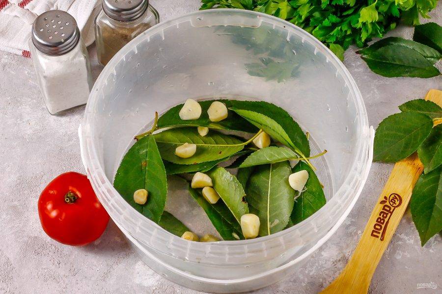 Промойте листья вишни, очистите зубчики чеснока и также промойте. Выложите листья на дно подготовленной емкости: пластиковой для пищевых продуктов или стеклянной, но не металлической! Нарежьте туда же зубчики чеснока слайсами.