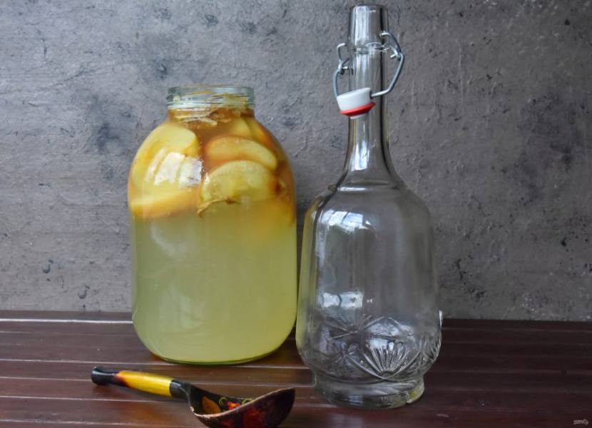 Напиток процедите, разлейте по бутылкам. Для более сильной газации можно добавить в бутылку с сидром по 1 ч.л. сахара, меда или сиропа. Оставьте бутылки на сутки при комнатной температуре, затем поставьте и храните в прохладном месте или в холодильнике.