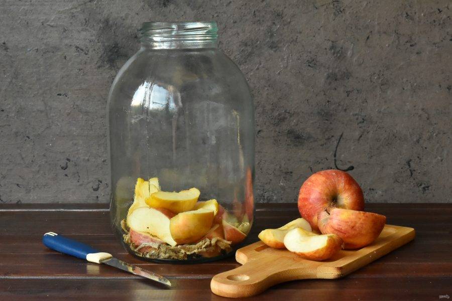 Яблоки нарежьте на четвертинки, удалите стопки и сердцевину с семечками. Переложите яблочные дольки в подготовленную банку. Туда же положите имбирь и влейте сироп топинамбура (или мед, сахар). Залейте воду, оставив место для брожения.