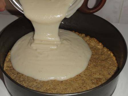 6)На остывший корж выкладываем рисовый крем и ставим в холодильник на 20 минут.