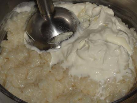 2)Сливки взбить, добавить в готовый рис и перемолоть все в блендере до пышного кремообразного состояния.