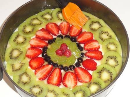 7)Затем достаем, разкладываем на поверхности фрукты. Желатин предварительно замоченный и разведенный на водяной бане смешиваем с соком. Покрываем фрукты тонким слоем силиконовой кисточкой. Убираем в холодильник до полного застывания, лучше на ночь.А утром здоровый и вкусный завтрак готов.