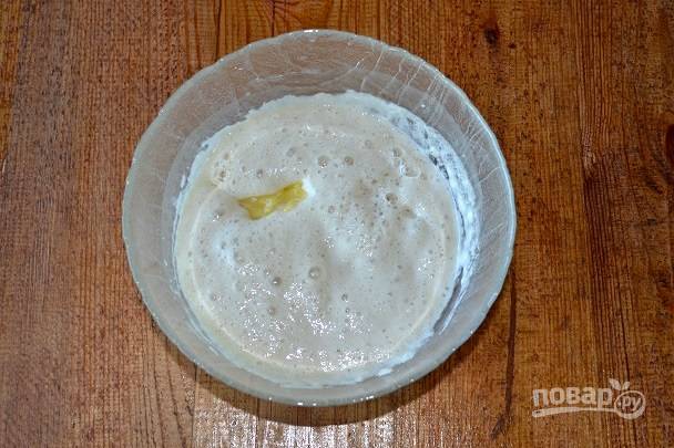 В готовую опару отправьте яйца и растопленное сливочное масло.