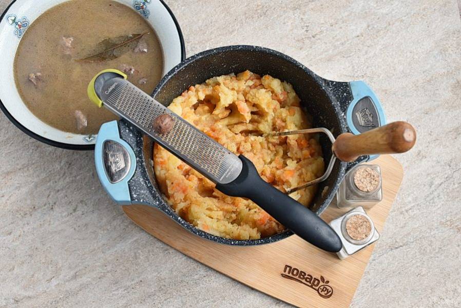 После этого достаньте мясо и слейте бульон, оставив немного, чтобы было легче приготовить пюре.
