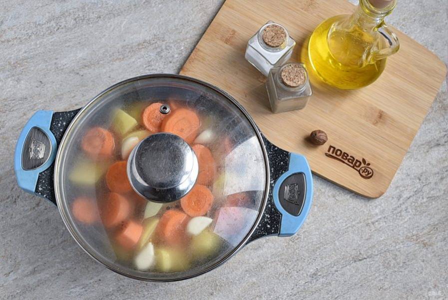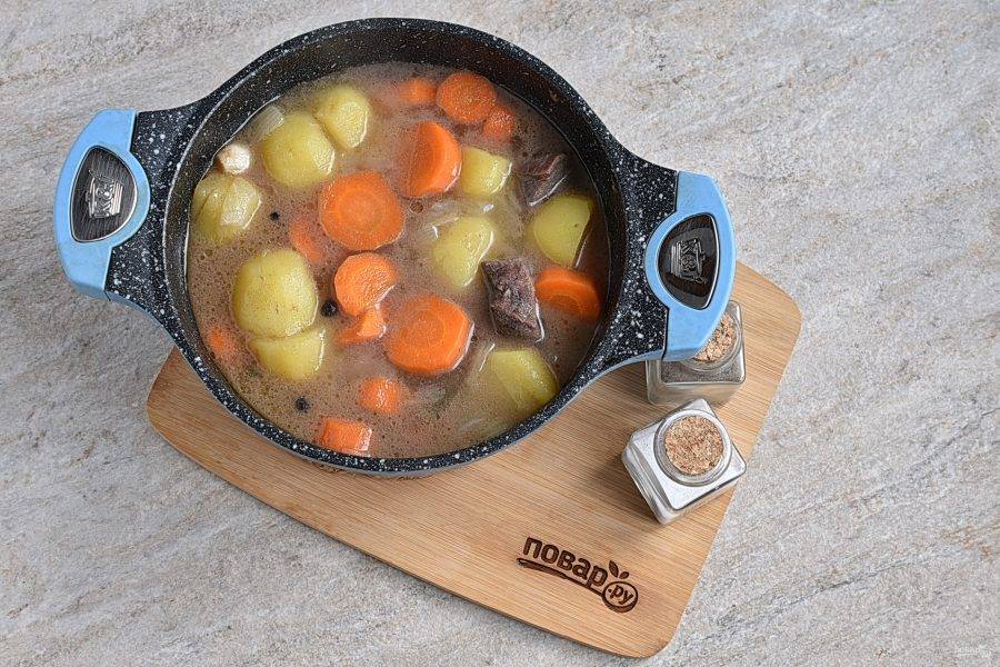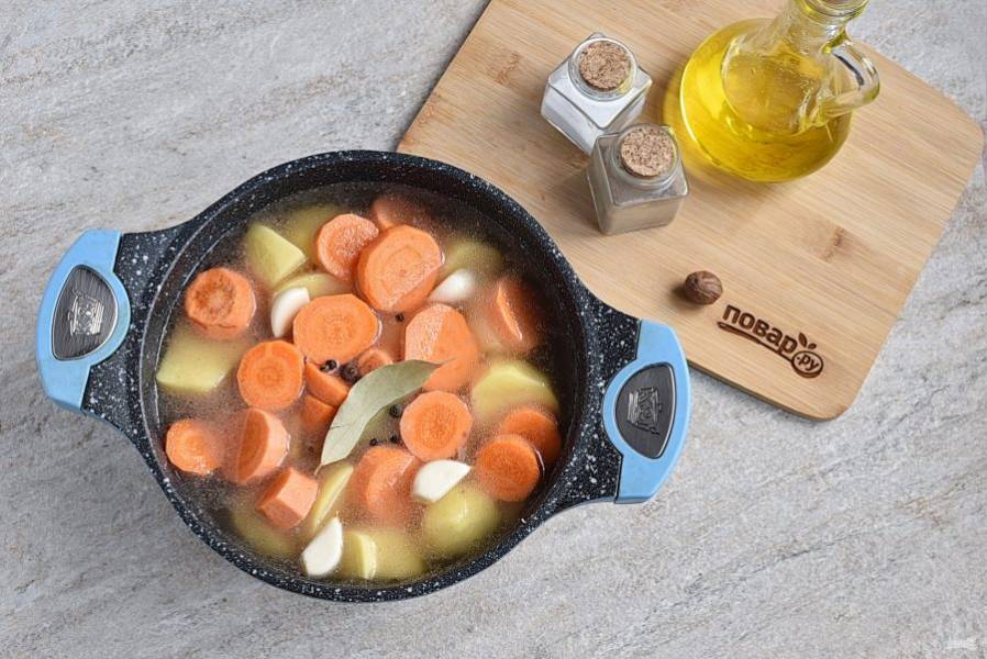 Добавьте крупно порезанные картофель и морковь, зубчики чеснока. Залейте все кипятком так, чтобы только покрывало продукты. Добавьте целые пряности, посолите, выложите лавровый лист.