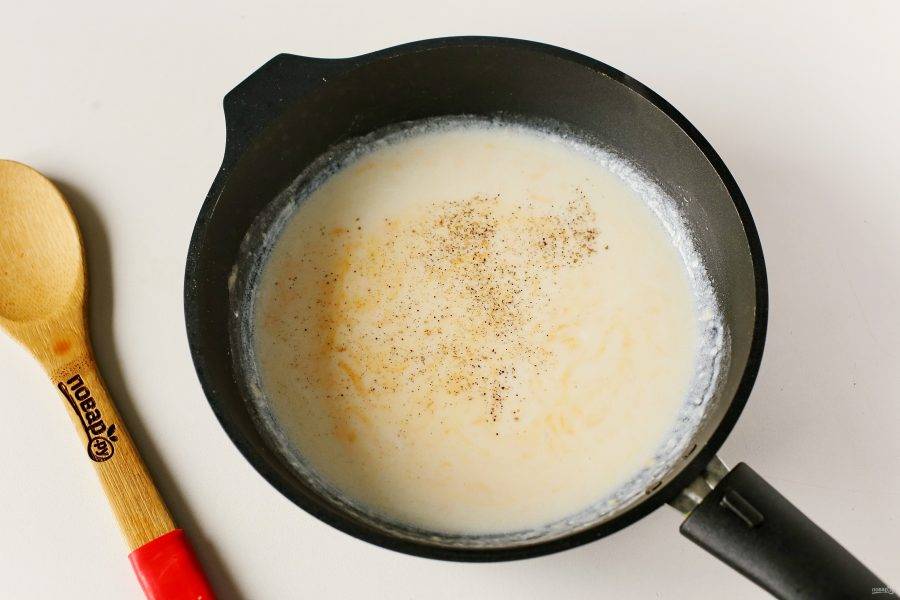 За несколько минут до готовности приготовьте соус. В сковороду налейте столовую ложку масла, добавьте муку и слегка обжарьте ее. Затем частями влейте молоко, посолите соус и поперчите по вкусу. Доведите до кипения, добавьте тертый сыр, перемешайте и сразу снимите с огня.