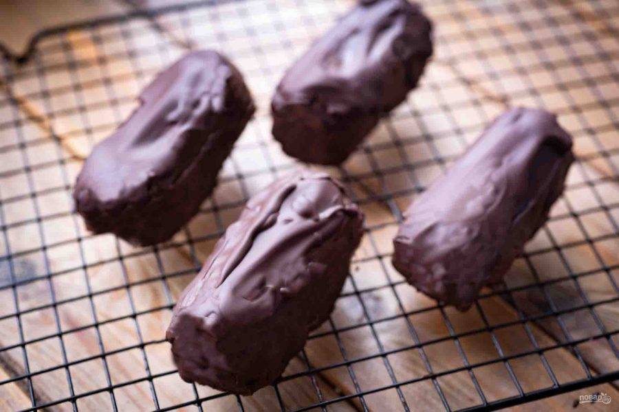Покройте хорошо охлажденные заготовки сырков шоколадной глазурью и отправьте вновь в морозильную камеру примерно на час.
