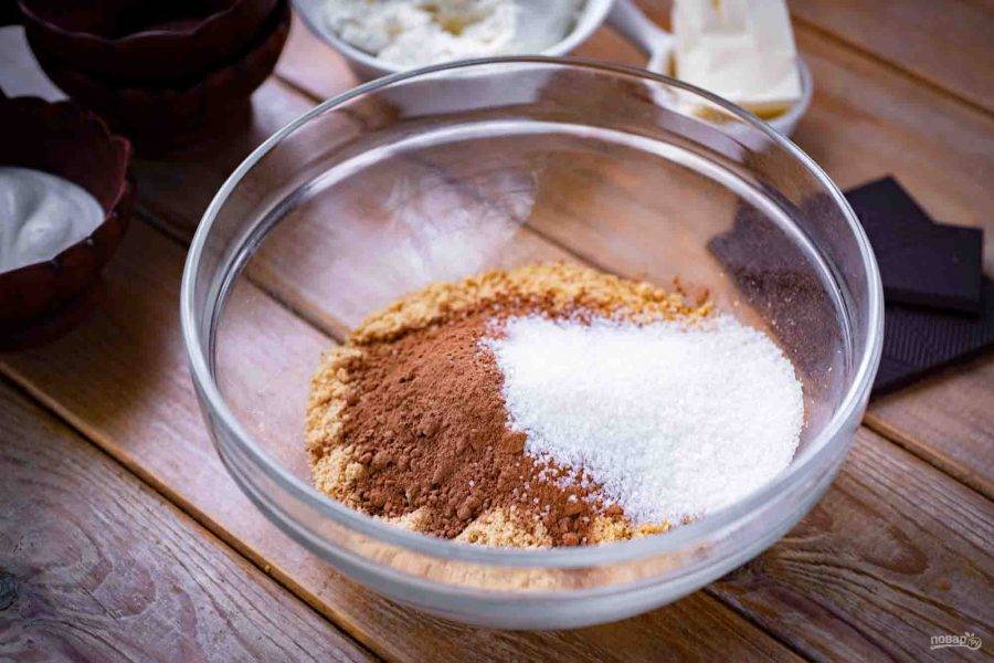 К песочной крошке добавьте сахар, какао. Перемешайте ложкой.
