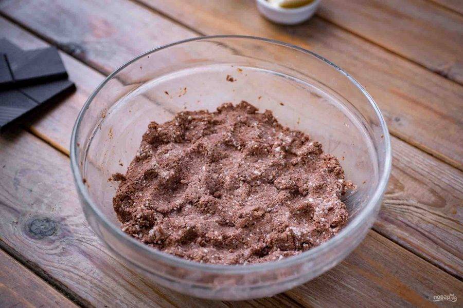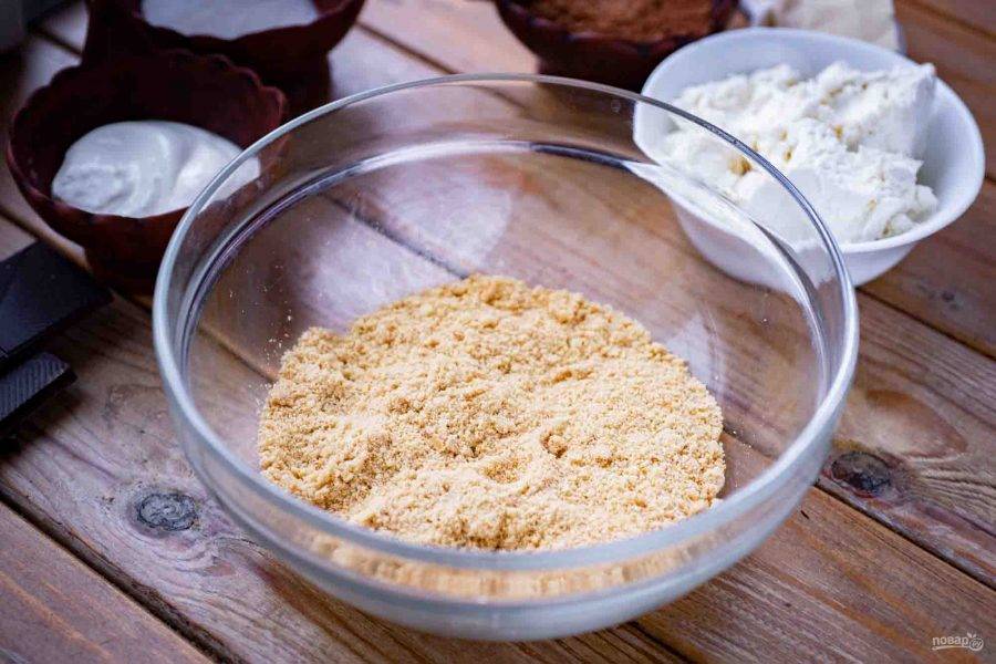 Измельчите печенье в мелкую крошку с помощью блендера. Всю крошку выложите в просторную миску.