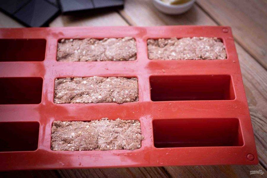 Сформируйте из песочной массы заготовки сырков. Я разложила всю массу по специальным силиконовым формочкам. Заготовки сырков отправьте в морозильную камеру на 2-3 часа.