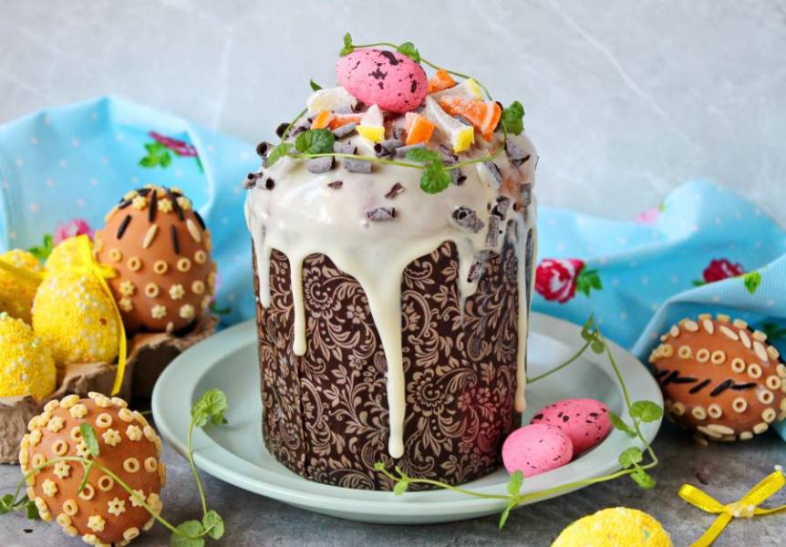 Готовую глазурь нанесите на холодный кулич, украсьте по своему вкусу и уберите в холодное место на 4-5 часов для застывания. Лучше всего наносить глазурь на поверхность тонким слоем несколько раз, с небольшим интервалом, если не хотите, чтобы были сильные потеки.