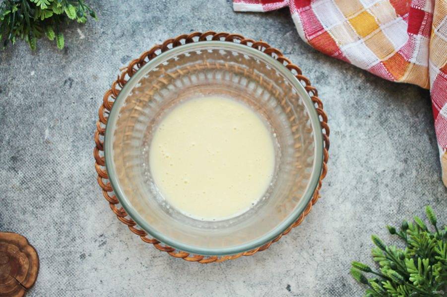 Вливайте горячую воду в миску по одной столовой ложке, каждый раз, хорошо перемешивая венчиком. Воды может понадобиться больше или меньше, в зависимости от качества молока. Масса должна быть по консистенции как кефир.