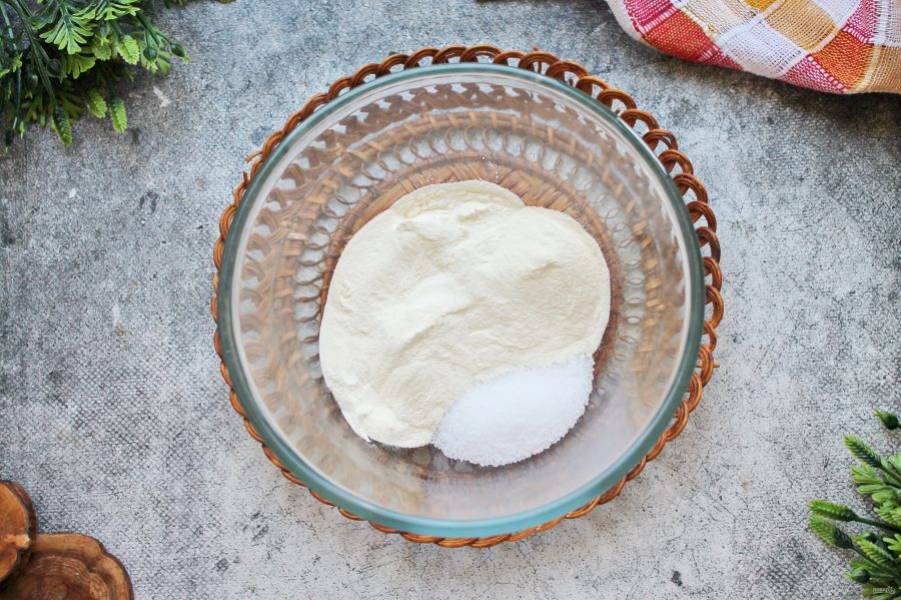 В миску насыпьте сухое обезжиренное молоко и добавьте фруктозу, перемешайте.