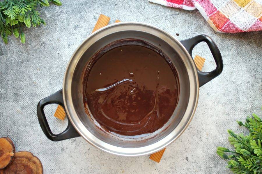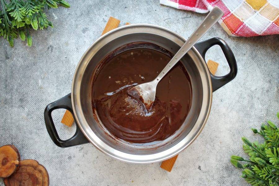 Горький шоколад измельчите, добавьте в кастрюлю и перемешайте. Нагревайте все до однородности.