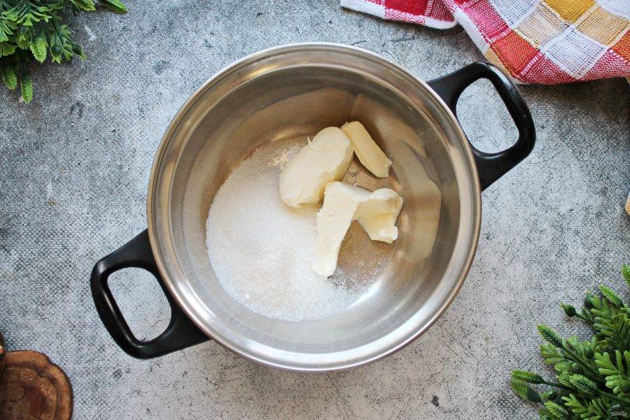В кастрюлю с толстым дном всыпьте сахар и выложите сливочное масло. Поставьте все на медленный огонь и нагревайте пока масло не растает.