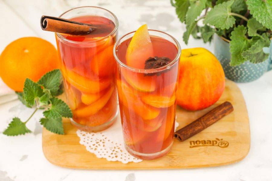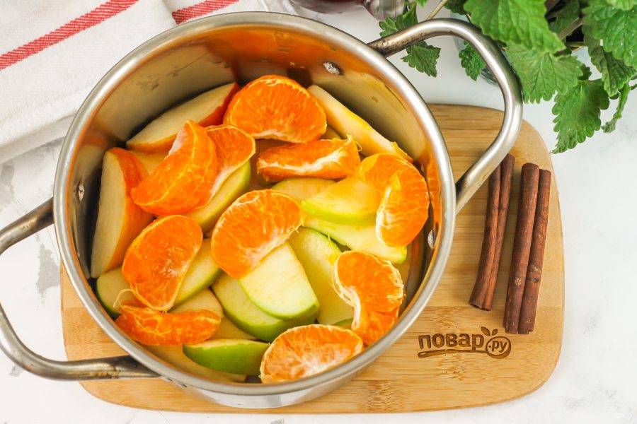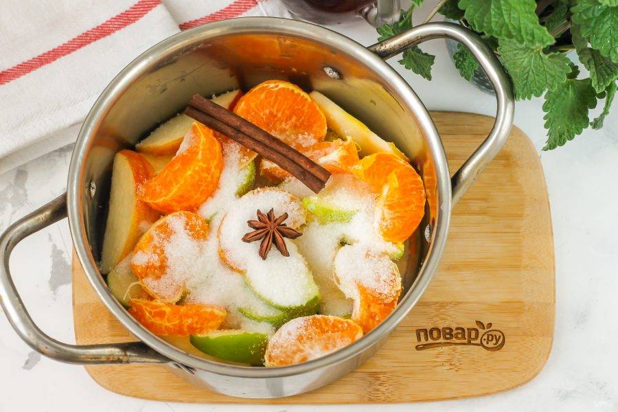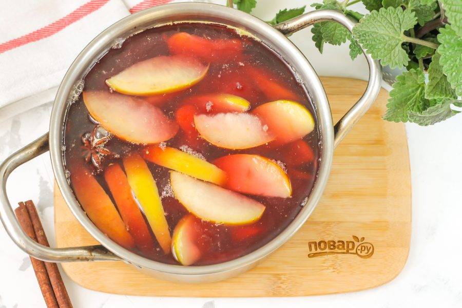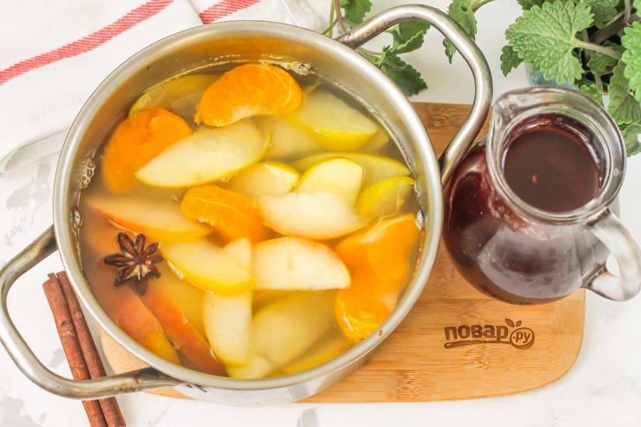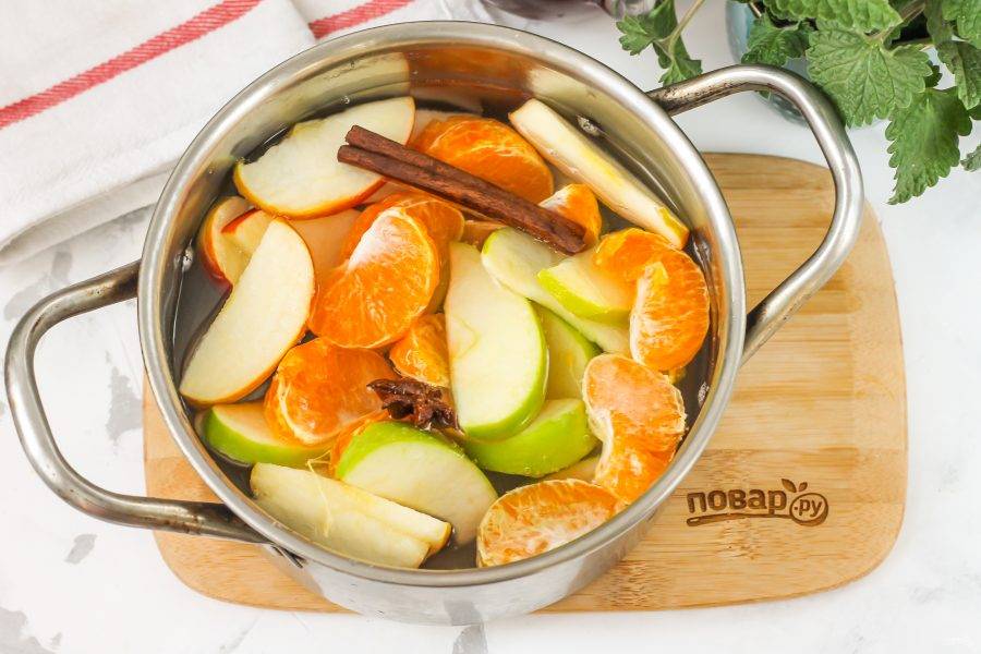 Как только яблоки и цитрусовые отдадут жидкости свой цвет, вкус и аромат, уменьшите нагрев до минимального.