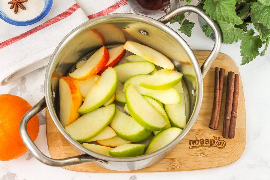 Яблоки промойте в воде, разрежьте на четыре части и удалите семенные блоки. Нарежьте каждую четвертинку ломтиками прямо в кастрюлю.