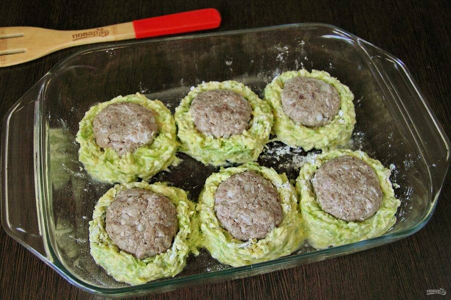 Теперь кабачки небольшими порциями окуните сначала в яйцо, затем обваляйте в муке и выложите в форму для запекания в виде гнезда. Из фарша сформируйте колобки и уложите их в "гнезда".