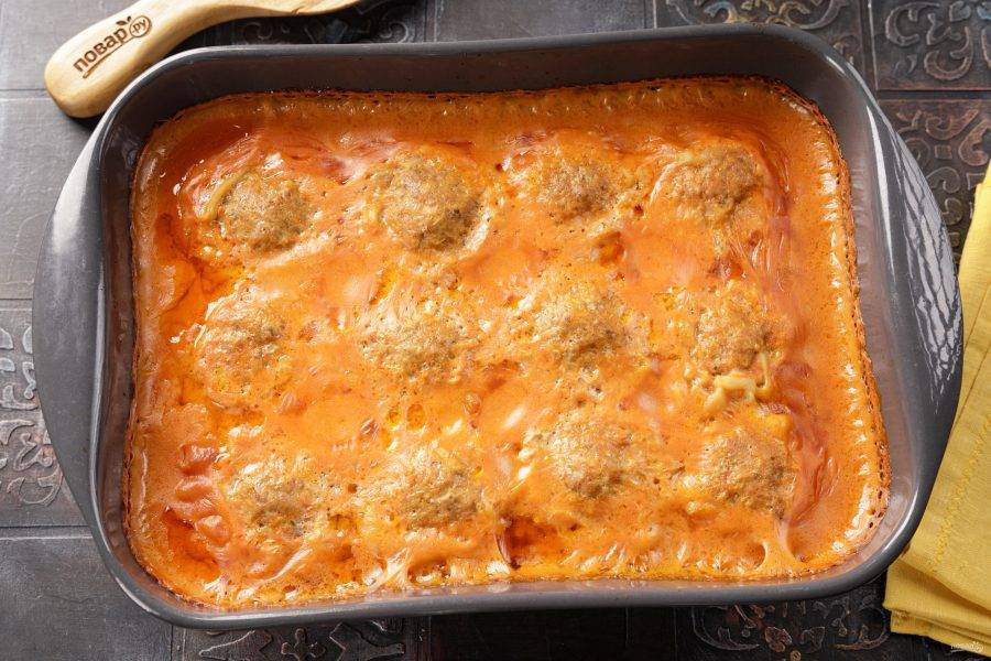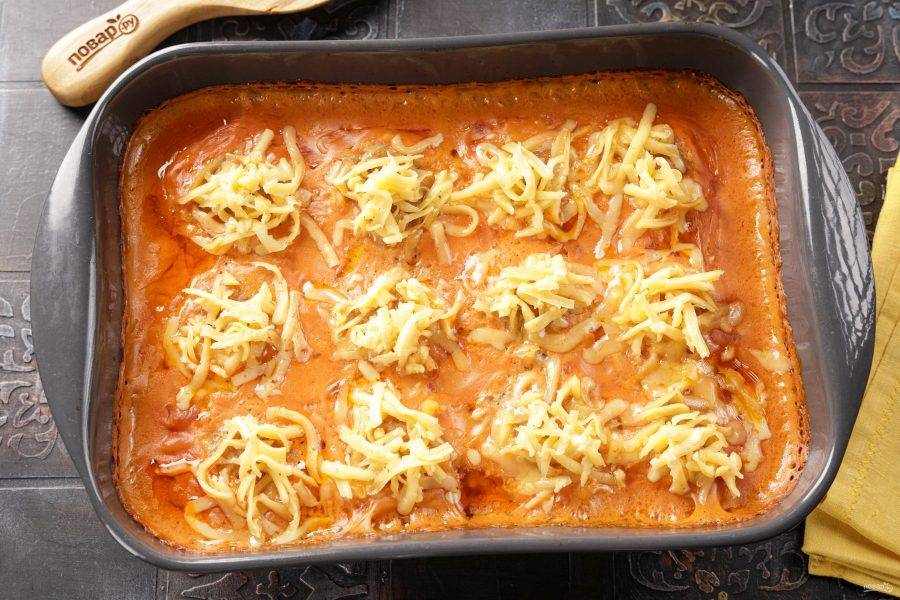 Полейте макароны с фаршем сверху томатно-сметанным соусом. Соус должен покрывать гнёзда не менее, чем на 2/3.