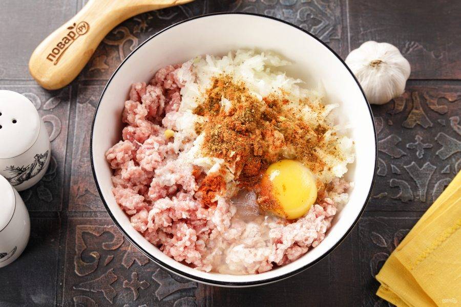 В глубокой миске соедините фарш, тёртый или нарезанный мелко лук, яйцо, давленный чеснок, соль и специи по вкусу.