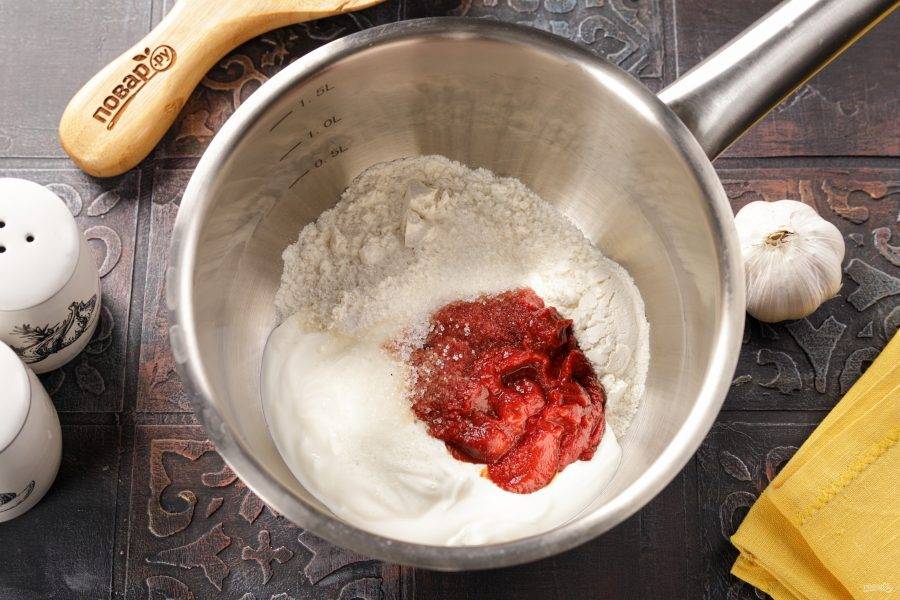 Отдельно соедините муку, томатную пасту, сахар, сметану и соль.