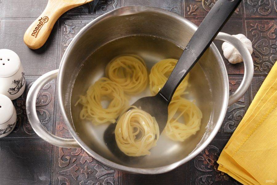 Опустите макароны в кипящую подсоленную воду (вода должна быть выше макарон не более, чем на 2-3 см.) и варите 1-2 минуты. Этого времени будет достаточно, чтобы лапша стала мягче и податливее для фаршировки.