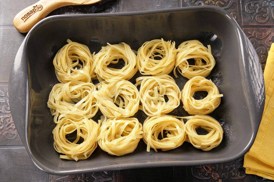 Шумовкой достаньте "гнезда" из воды и переложите в форму для запекания.