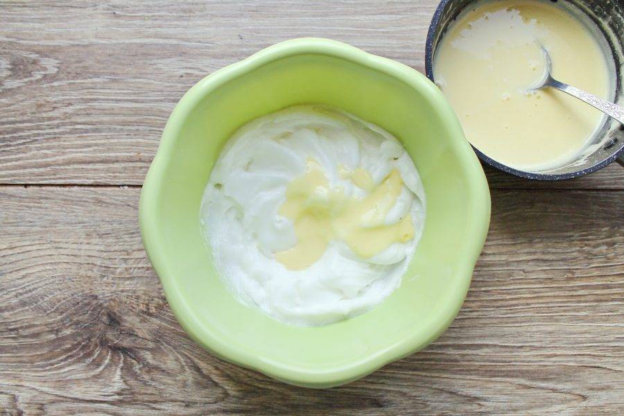 Добавляя по одной столовой ложке заварную смесь, все время, взбивая до соединения обеих масс.