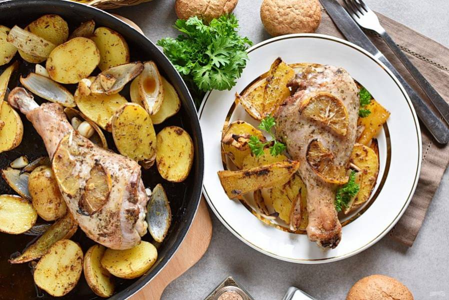 В форму для запекания выложите голени, посолив и поперчив их по вкусу. Присыпьте сверху остатками орегано и разложите тонкие ломтики лимона.