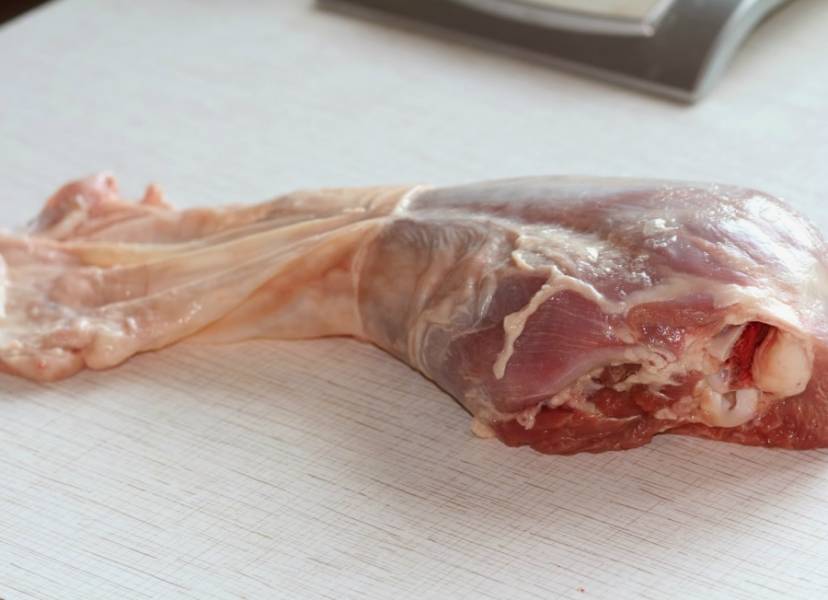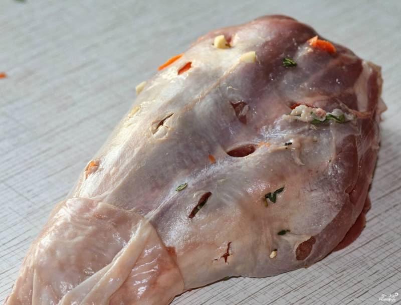 Для начала сполоснем голень под проточной водой. Я взяла крупную часть индейки, весом под килограмм. Чтобы индейка получилась сочной и пряной, я пойду на хитрость. Снимаем кожу с голени в сторону сужения сустава. Делаем глубокие надрезы в мясе ножом для того, чтобы заложить внутрь специи и нарезанные овощи.