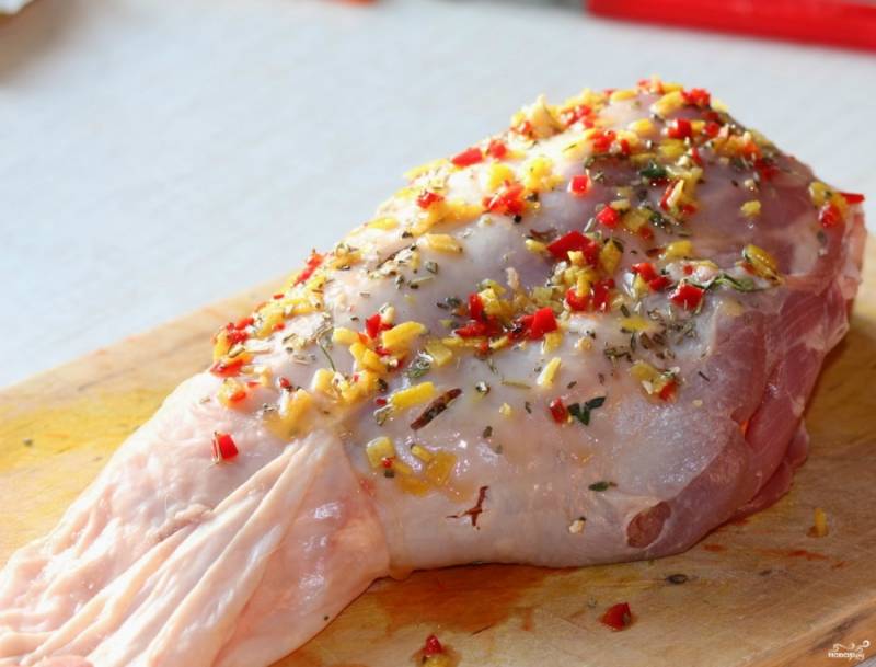 Делаем соус. Натираем лимон для получения цедры. Перец чили очищаем от семян и мелко рубим. Смешиваем в отдельной посуде итальянские травы или любые другие специи вместе с цедрой лимона, перцем чили, медом, солью и оливковым маслом. Обмазываем голень этой смесью и закрываем ее кожей. Оставляем ее на пару часов для маринования.