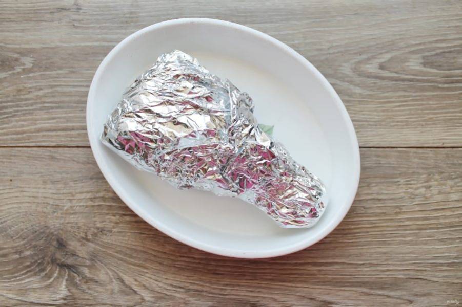 Выложите голень вместе с соусом в фольгу и тщательно ее заверните, выложите в форму для запекания.