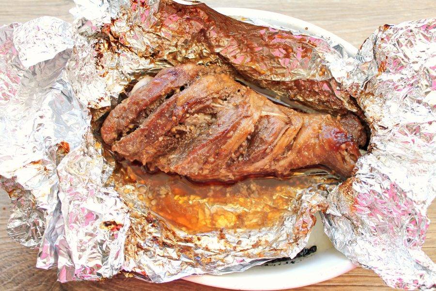 Форму с голенью поставьте в горячую духовку и запекайте при температуре 180 градусов в течение 90 минут. Спустя время достаньте форму с индейкой из духовки и, не развертывая, дайте постоять в течение 10 минут.