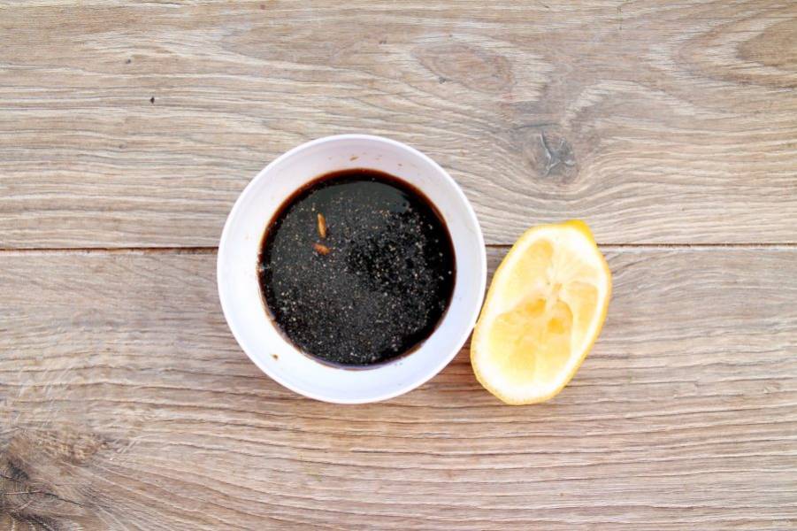 В миске смешайте соус терияки, лимонный сок, перец и измельченный чеснок.